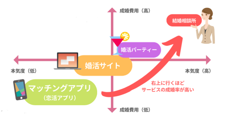 出会いの確率は婚活サイトやマッチングアプリの方が高い印象を受けるかもしれませんが、将来を考え一緒に寄り添うアドバイザーがいる結婚相談所が結婚を意識した活動が出来ます。